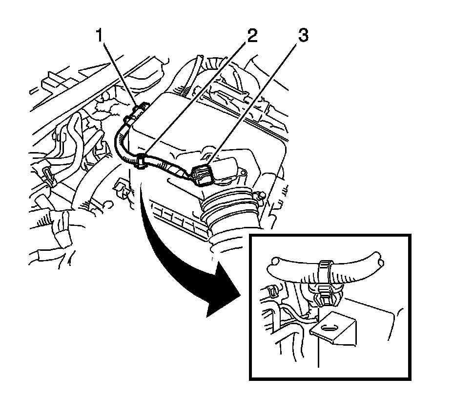 4. Disconnect the mass air flow meter connector (3) and the 2 wire harness clamps (1, 2).