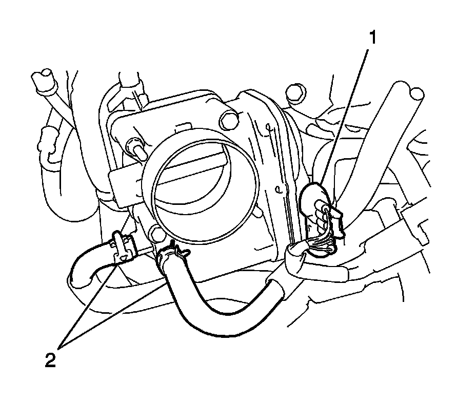 3. Connect the 2 water by-pass hoses (2) and the throttle body connector (1).