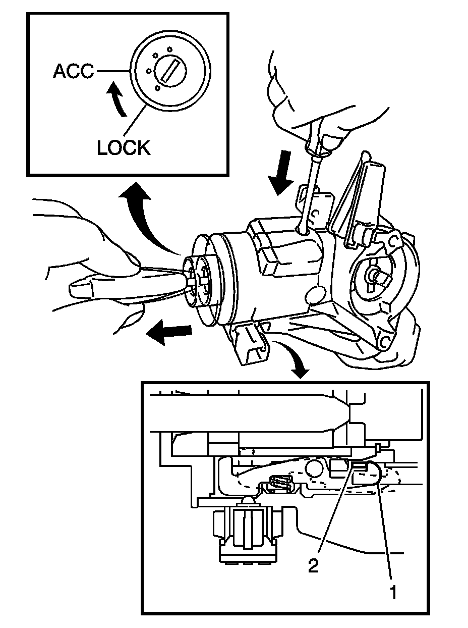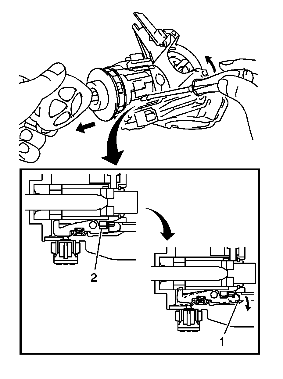 5. Insert a screwdriver into the hole of the ignition lock cylinder case, pull the ignition lock cylinder until its claw (1) contacts the stopper (2) of the ignition lock cylinder case.