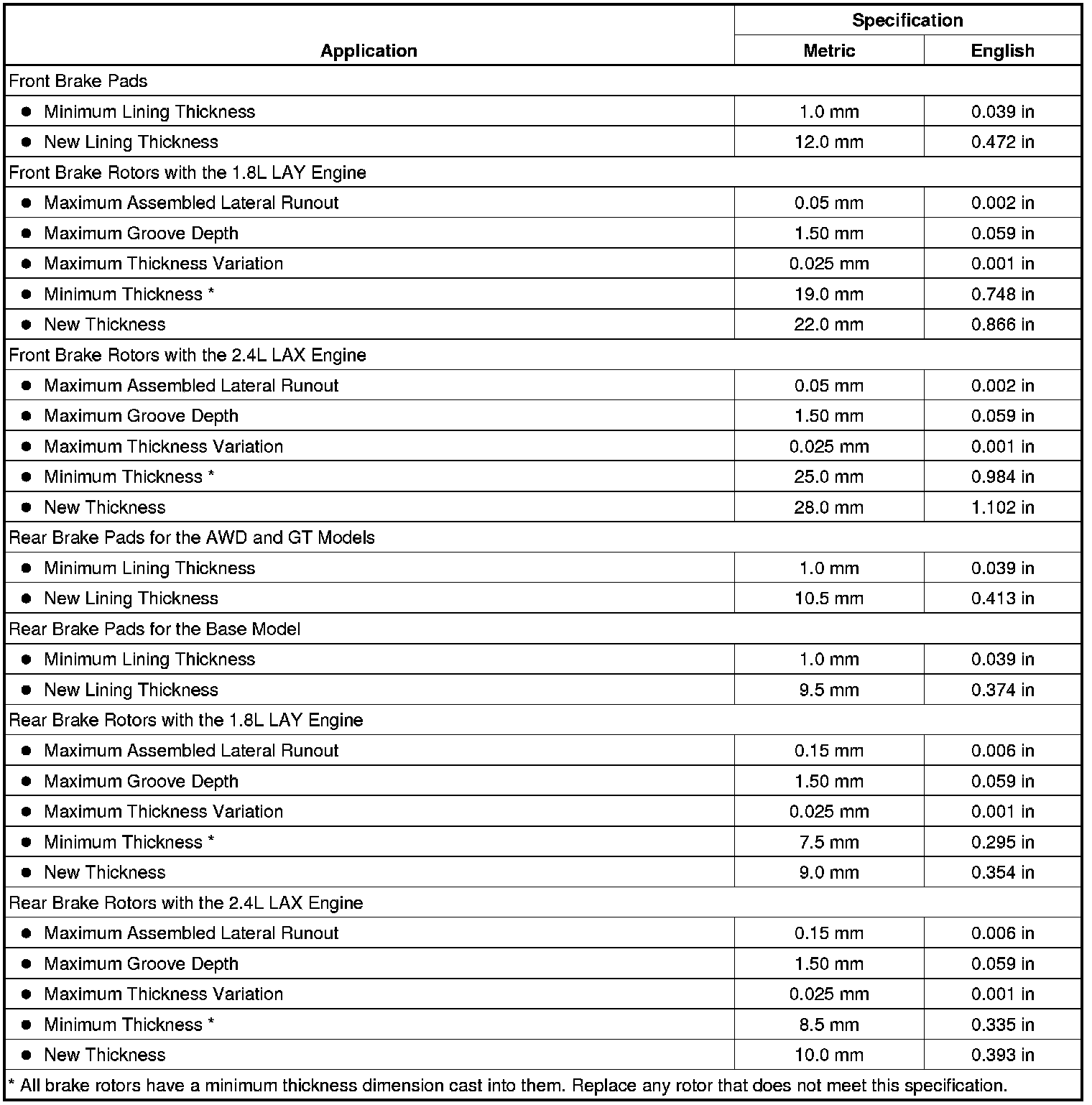 Disc Brake Component Specifications