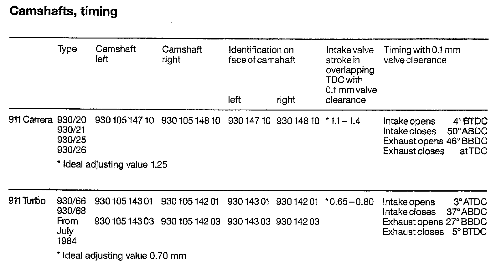 Camshafts Timing Specifications