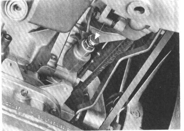 Note: Drive belt adjusting screw (arrow) is located on bottom of engine at front right-hand side.