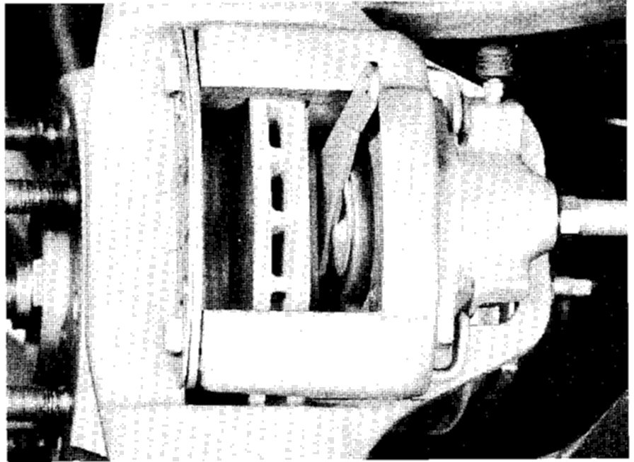 7. Place a piece of wood in caliper frame to prevent damage, drive brake piston housing off of caliper frame with a plastic hammer applied at different points on housing.