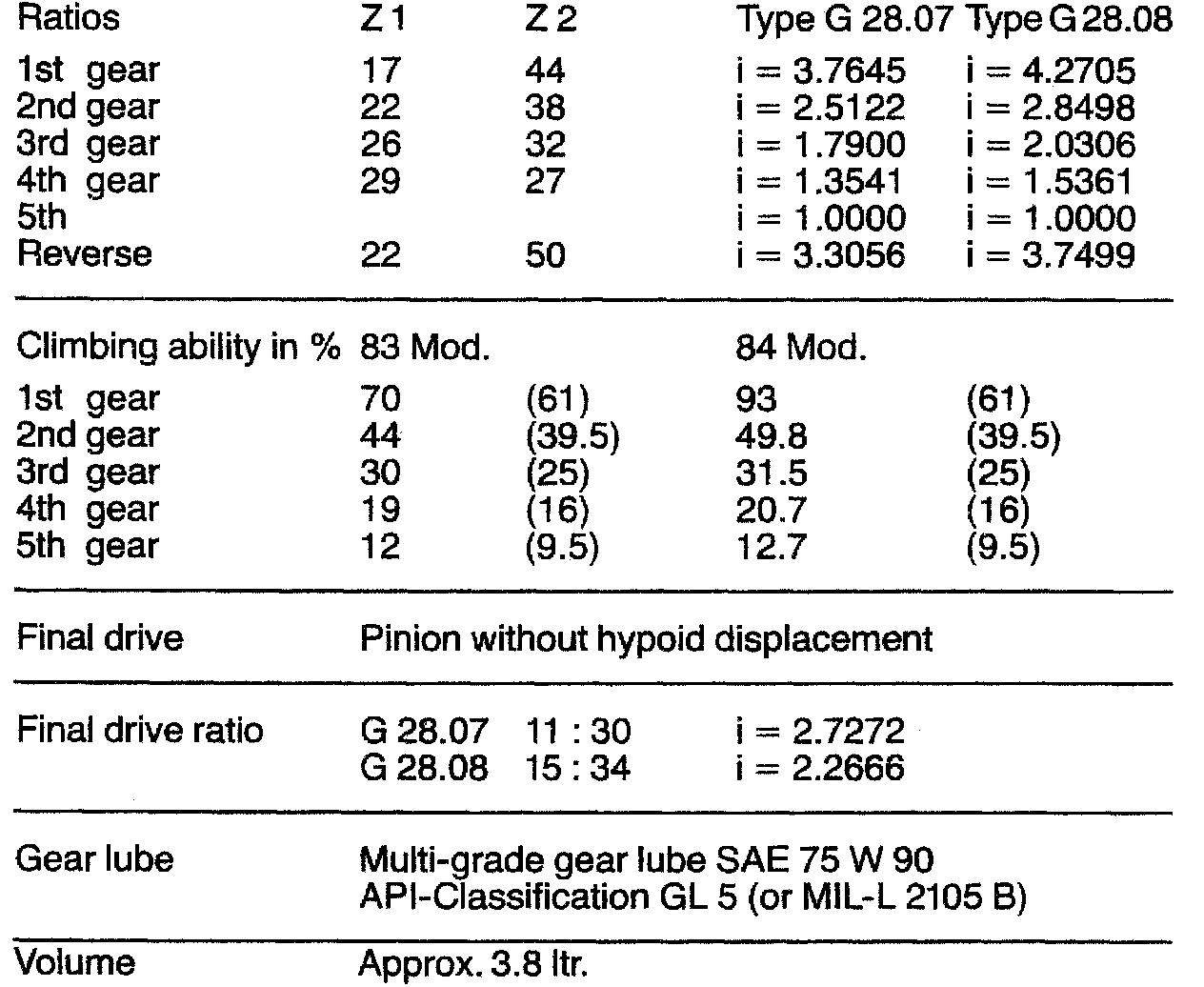 G28.08 Transmission Technical Data:
