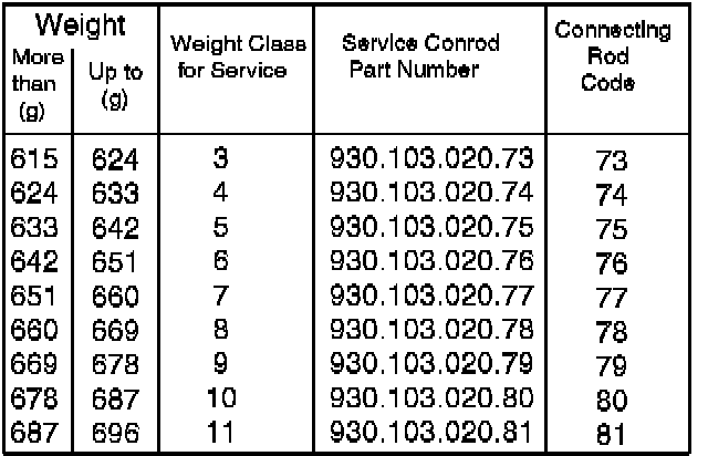 Note: The connecting rods installed in one engine must not differ in weight by more than 9 grams. Weight a complete connecting rod, but without bearing shells, to determine the weight class.