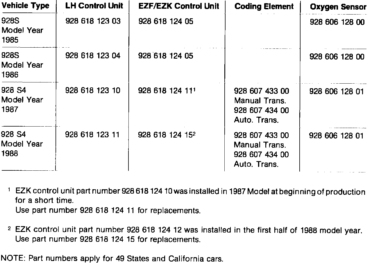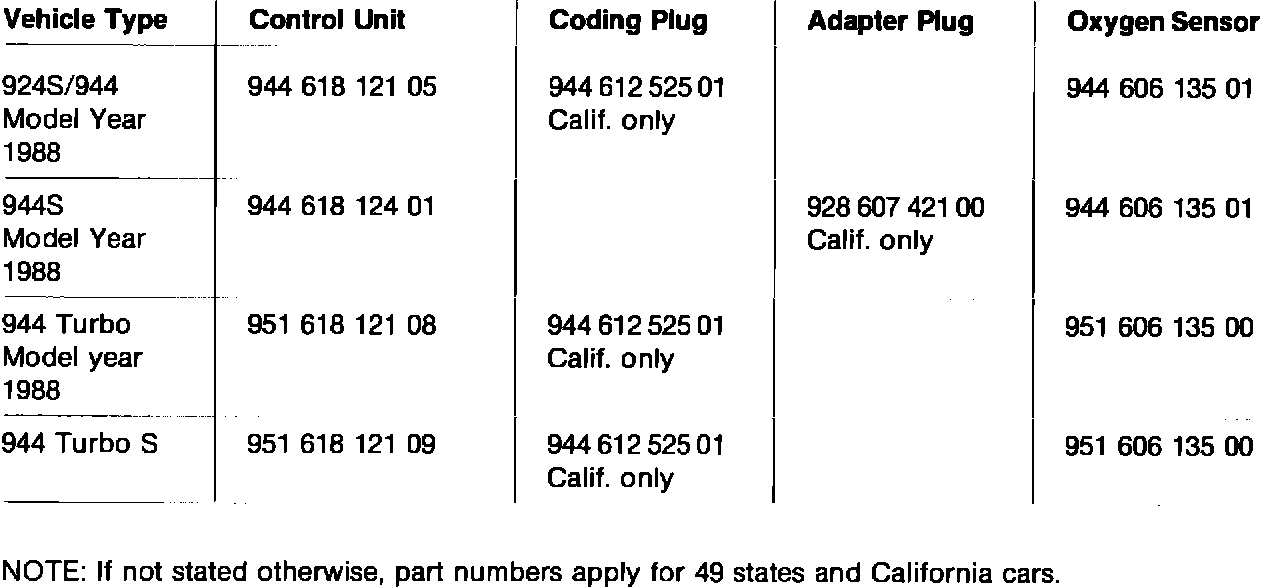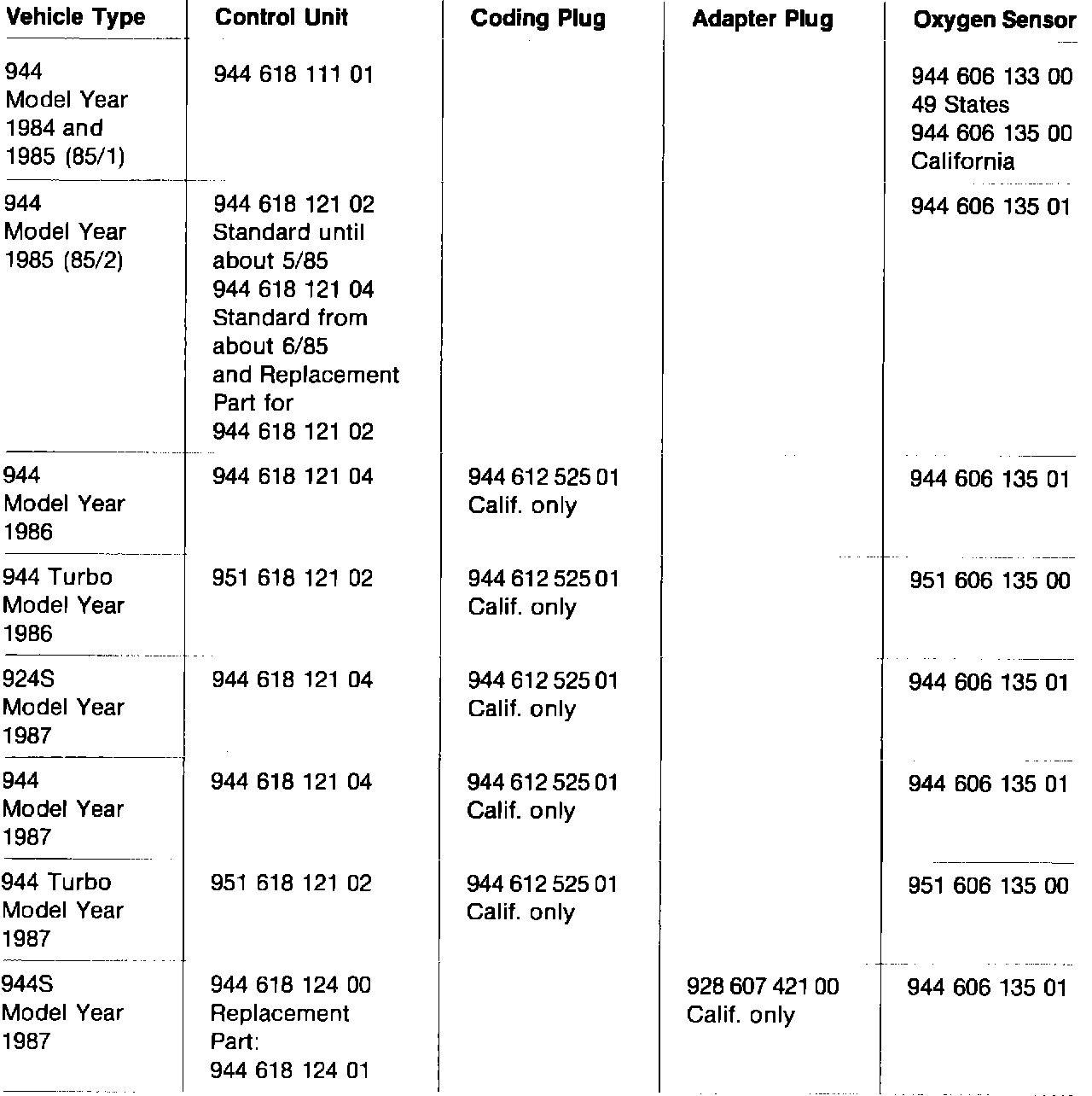 This Technical Bulletin contains a listing of control unit part numbers and coding plug, adapter plug and oxygen sensor applications. Always consult with the Parts Department for the latest part number information.