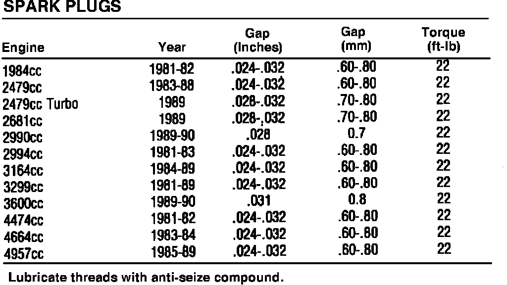 Spark Plugs Specifications: