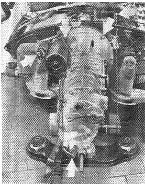 b) Unscrew 4 mounting nuts and take transmission off of engine.
