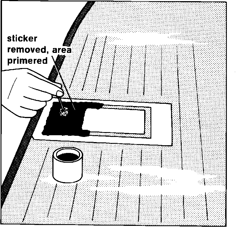 Line up markings and apply sticker to window carefully. Remove center part of sticker and blacken this area with glass primer using an applicator as shown in picture. (Picture shows 944 window removed.)