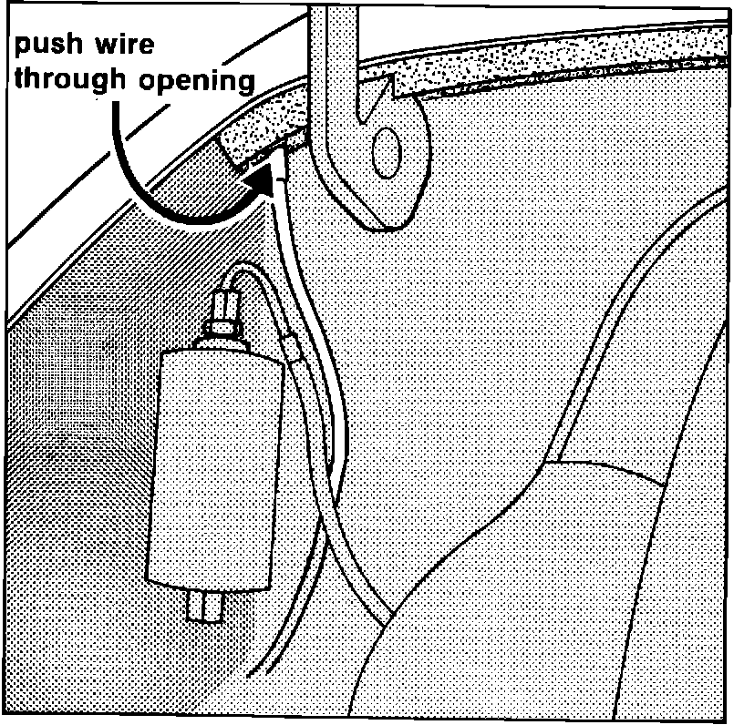 2. Route wiring along left side of engine compartment. Secure with existing wire clamps and push wire through harness opening which leads into driver's compartment (see picture). Replace grommet, Part Number 477 971 871 A, if necessary.