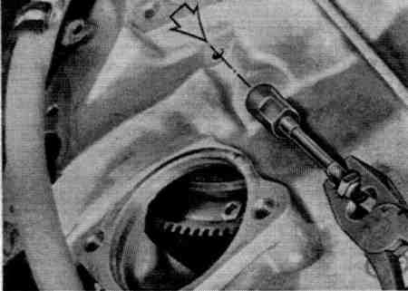- Mount clutch housing and release lever together with release bearing to engine. This requires that the bolt glued on the flywheel for the reference mark sensor faces down (danger of damage). Insert cover. Mount clutch housing with the two lower bolts.
