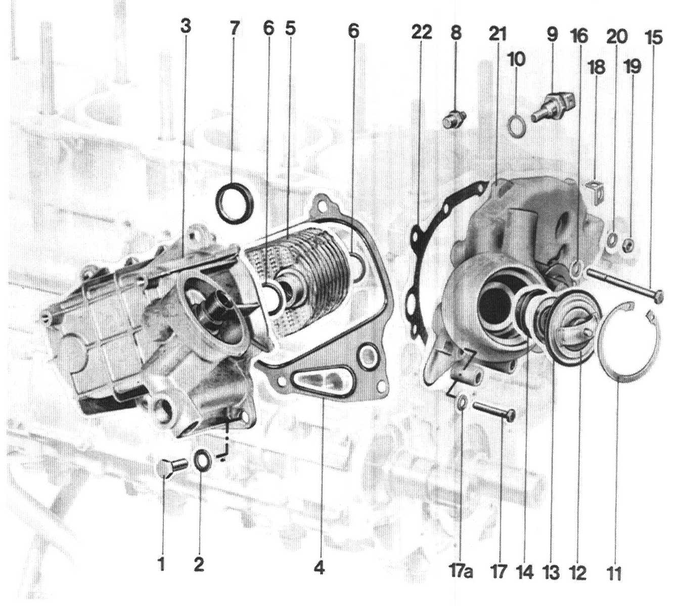 5 Oil/water cooler 1 Assemble in housing and mount together on upper crankcase section