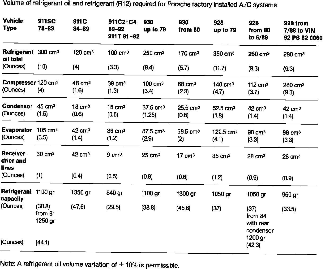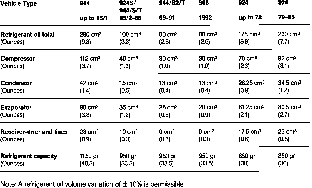 Volume of refrigerant oil and refrigerant (R12) required for Porsche factory installed A/C systems.