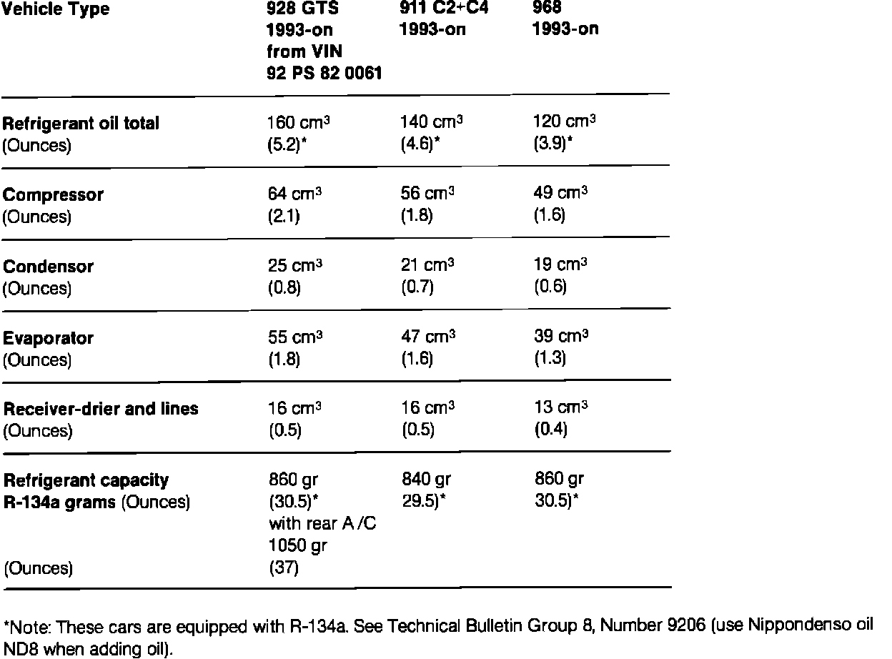 Volume of refrigerant oil and refrigerant (R-134a) required for Porsche factory installed A/C systems.