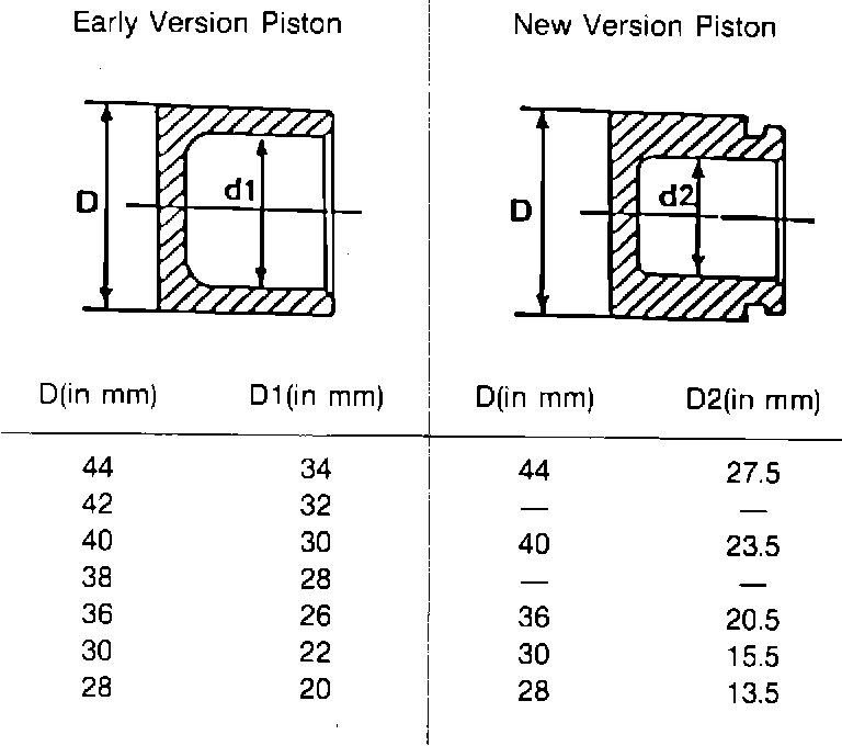 New type calipers can be fitted to earlier cars. After stocks of early version calipers are used up, only the new type calipers (with dust caps and modified pistons) will be available. New version calipers (with dust caps) cannot be paired with early version calipers (with scraper rings). Measure the brake piston diameters to be certain the correct calipers are installed during repairs. Failure to install brake calipers with the correct piston sizes side to side will cause uneven braking. Use the following chart to determine piston diameter applications.