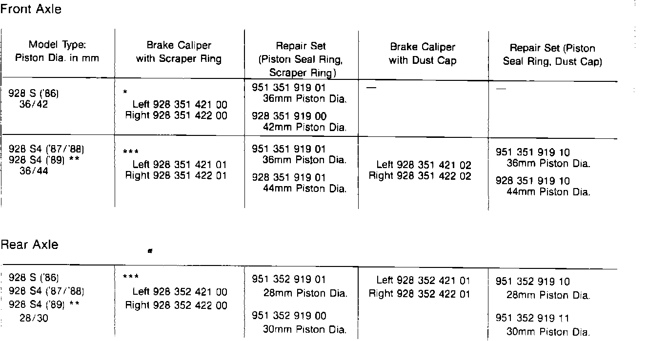 The front and rear brake calipers of the 944 S2, 944 Turbo, and 928 S4 for Model 89 received modifications in the area of the pistons and dust seals (now similar to the two piston calipers). Refer to the chart below for identification.