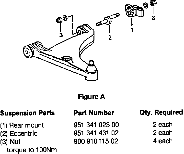 c. New caster eccentrics, rear mounts and nuts must be installed in the front control arms. This change is necessary due to a change in caster specification on vehicles equipped with Porsche 17" wheels. The specification for vehicles equipped with 17" wheels is 30 15'-45'.