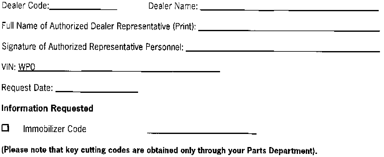 As of Model Year 1995, most Porsche vehicles use an immobilizing system to protect the vehicle from being stolen. From time to time it is necessary to access the immobilizing system. In an effort to ensure the security of the vehicles that use i~mobilizing systems, proof of ownership and the following information must be faxed or mailed to Porsche Cars North America, Inc., when requesting immobilizing system security codes.