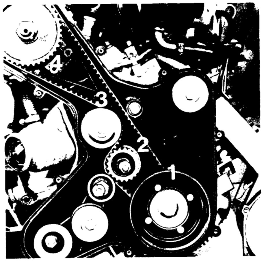 - Place belt on sprocket of crankshaft (1), tensioning roller (2), water pump pulley (3) and camshaft sprocket (4), preloading belt slightly by hand each time so that belt can be pushed on to camshaft sprocket