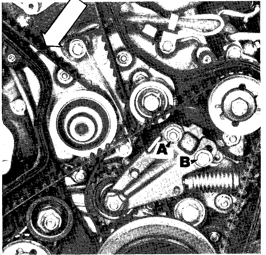 - When adjusting the camshaft drive belt tension, it is important to ensure free movement of the belt idler pivot. After loosening nut A and bolt B, apply downward thumb pressure twice, pressing the cam belt against the belt cover in the area indicated (arrow).
