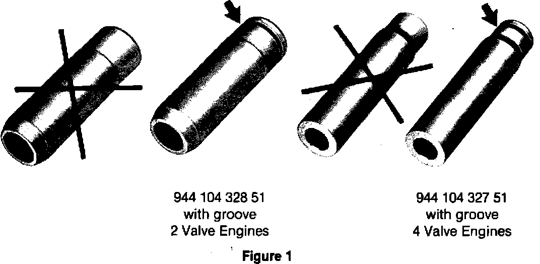 General Information: Valve guides installed in production in 924S, 944/S/T engines may not have the valve seal retaining groove that is on all replacement guides (Figure 1). Valve seals must be glued on guides without grooves.