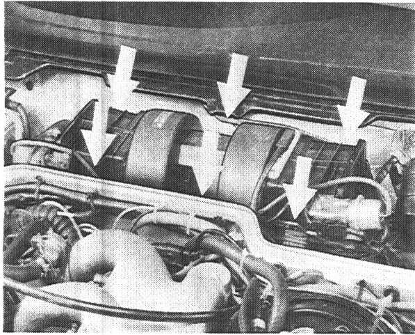 1. Remove fresh air well cover. This is done by disconnecting and pulling off windshield wiper arms. Pull off rubber seal from above and loosen cement of cover underneath the windshield. When performed carefully, the cover can be folded up to the windshield. It is then not necessary to remove the wiper arms.