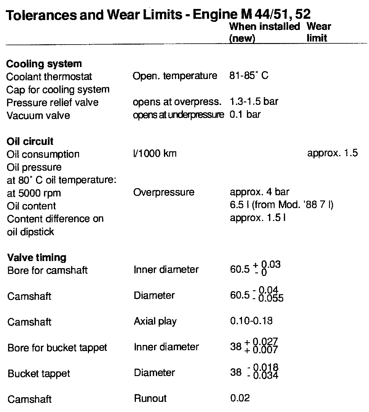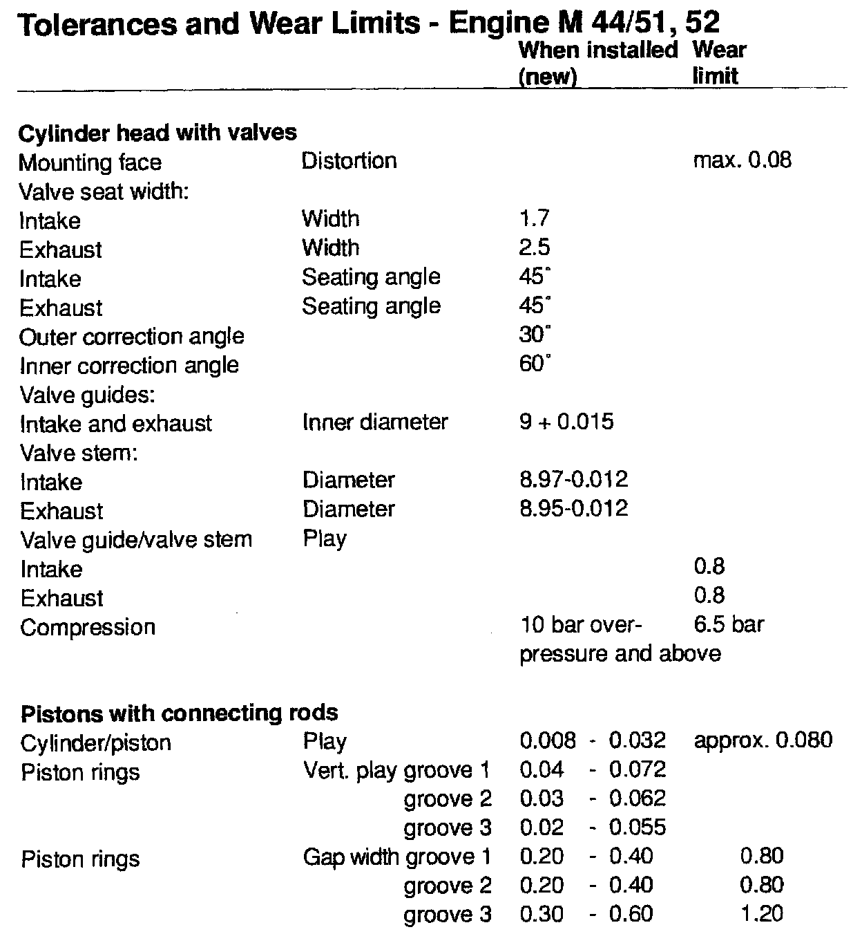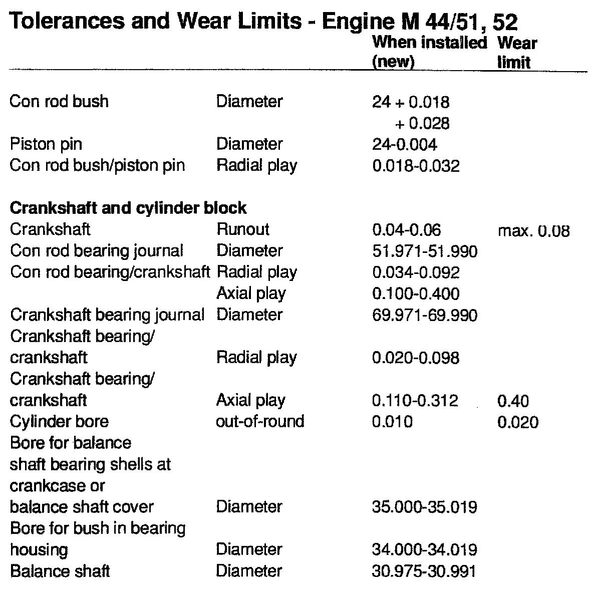 TOLERANCES AND WEAR SPECIFICATIONS