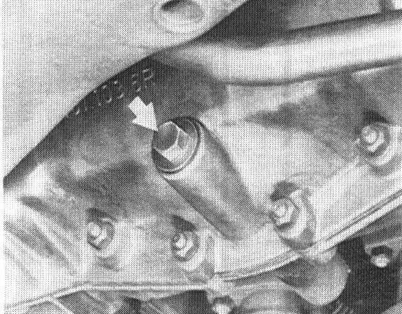 1. Remove engine guard. Undo the drain plugs in the crankcase and thermostat housing and drain out the engine oil.