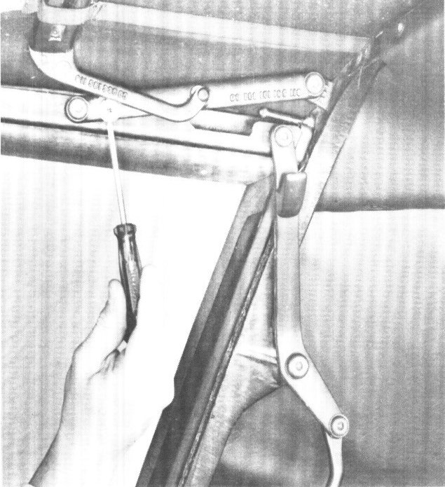 INTERMEDIATE ROOF SUPPORTAlignment of the intermediate roof support is accomplished by means of the cam disk mounted on the steering arm. The intermediate arm should be adjusted in such a way that the top covering material presents a smooth surface between the front and rear supports.