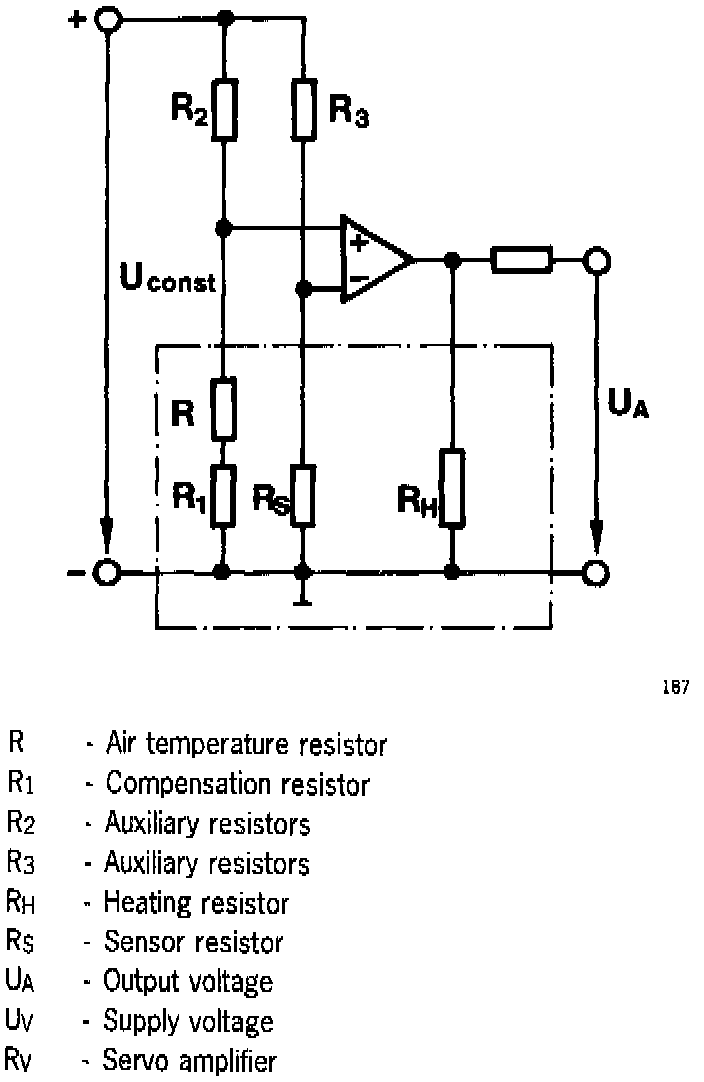 The servo amplifier Rv compares the current flow between the temperature resistor R and the sensor resistor Rs and influences the current flow lH to the heating resistor RH, in order to maintain a constant 16°C/32°F temperature differential between the intake air temperature and the temperature of the heating resistor RH. Regulation of this constant temperature differential is performed within in milliseconds.