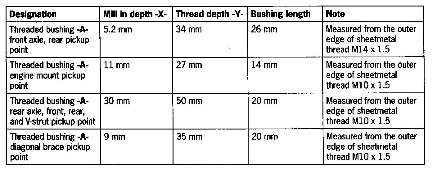 - Thread repairs are only permissible on the front axle pickup point bushing, engine mount pickup point, and front, rear, and V-strut rear axle pickup points listed.