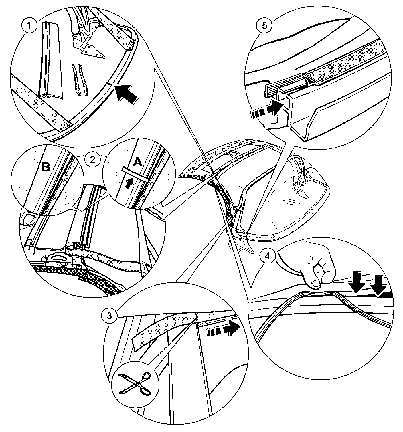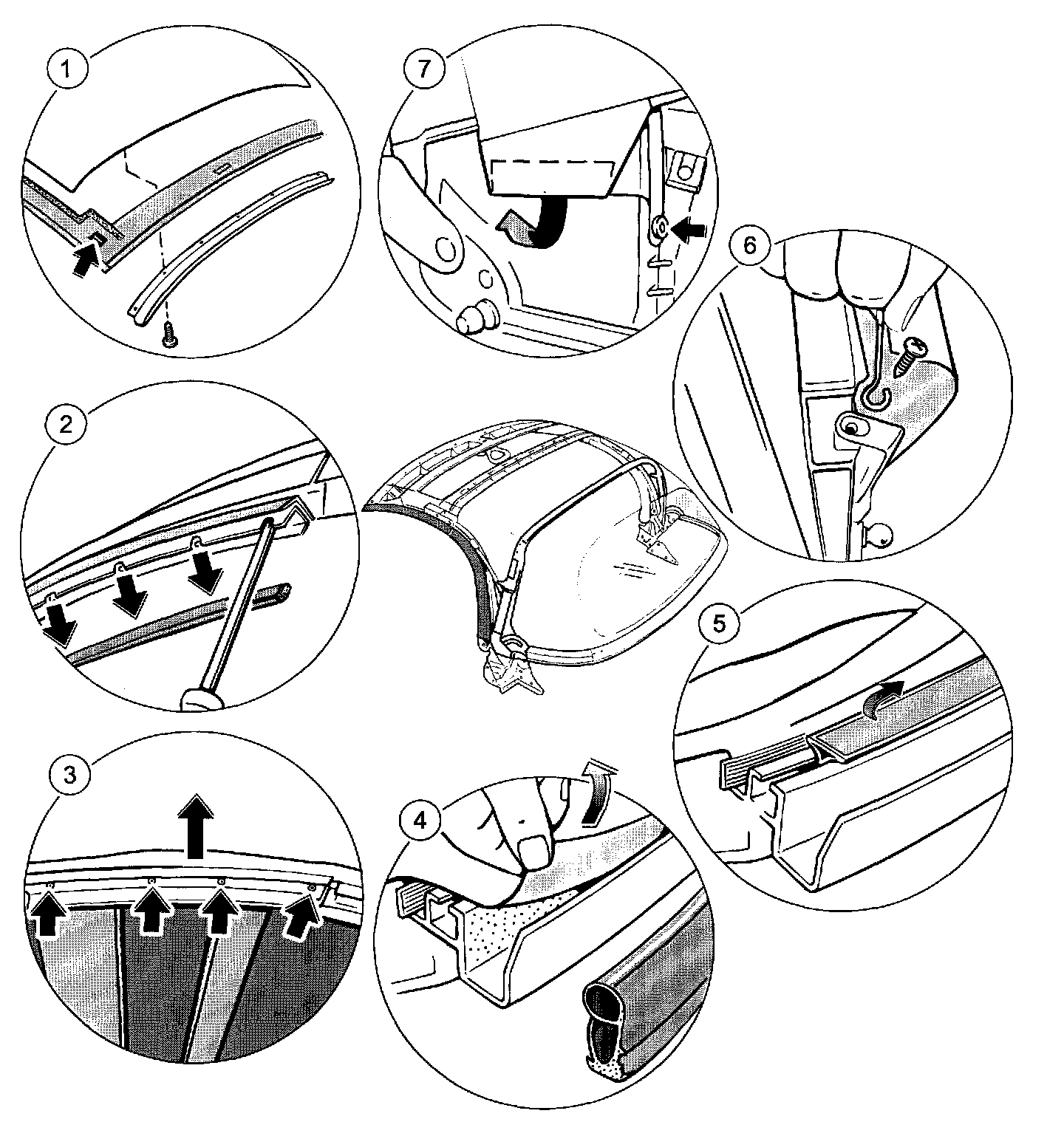 - Pull the additional seal out of the lower groove of the tension bow, pull the seal on the convertible-top covering out of the upper groove of the tension bow and pull the convertible-top covering down and off.