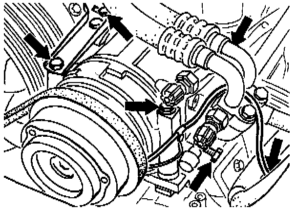 5. Move compressor to the left and take off V-belt. Take out mounting bolts and take off compressor.