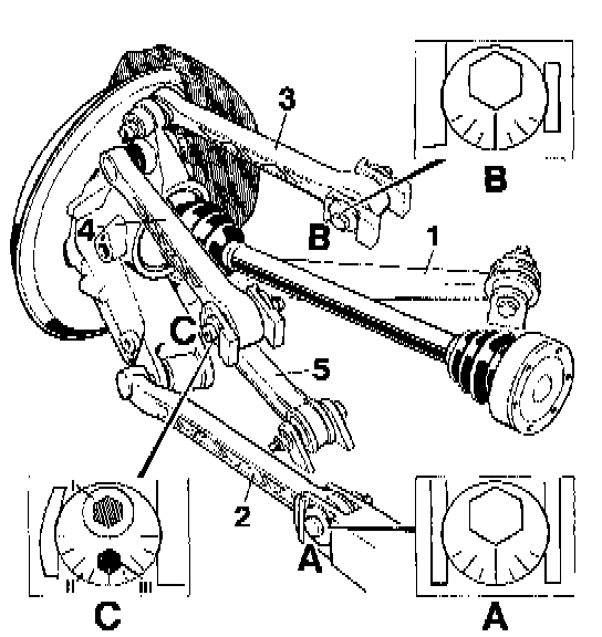 - Adjust at control arm 4 - area C - at eccentric washer II.