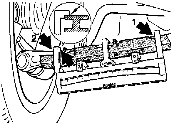 This prevents the measuring gauge from entering the radius range of the control arm (arrow no. 2) as this would give an incorrect measurement reading.