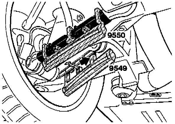 Special tool 9549 is fitted in the opposite direction, whilst the direction of special tool 9550 remains the same on the other axle side.