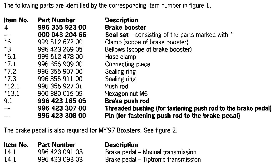 In order to install the brake booster with the latest style bellows in these vehicles, you must order the parts listed below (in bold). When performing the modification to MY'97 vehicles, the brake pedal will also have to be replaced.
