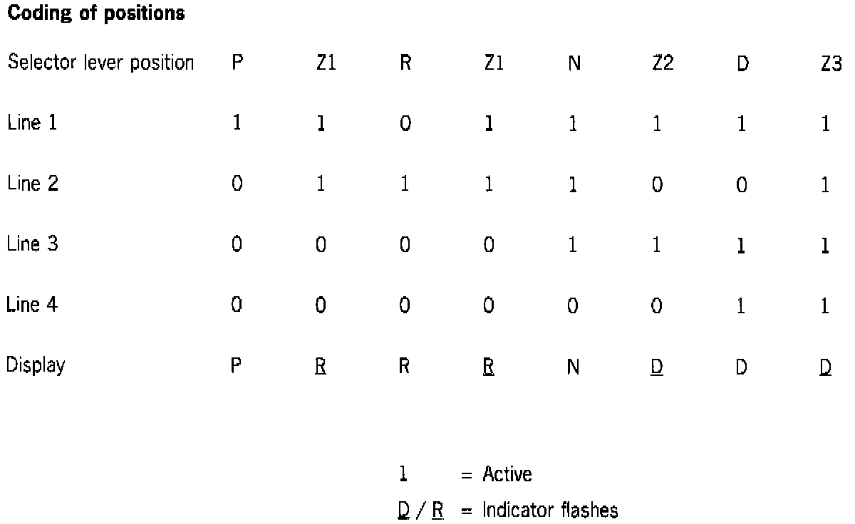 9 of the 10 pins on the switch are assigned. The lines 1 - 4 are reserved for the information sent to the Tiptronic control module regarding the position of the selector lever. If the selector lever is at an intermediate position (e.g. Z 1 = R flashes), the indicator flashes.