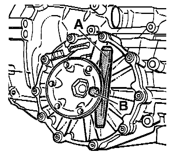 1. Remove the flanged shaft. To do this, place a chisel or spacer "A" under the flanged shaft and pull out the flanged shaft by turning the screw "B".