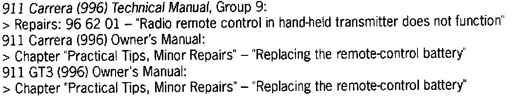 The newly printed editions of the vehicle Owner's Manuals will contain a note that the battery for the remote control should be changed by the Porsche dealer.
