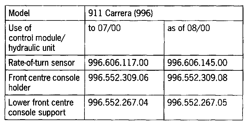 NOTE: Observe the allocation to the rate-of-turn sensor! The control module as of 08/00 performs a self-test of the rate-of-turn sensor. This control module must be installed only in combination with the rate-of- turn sensor with part No. 996.606.145.00.