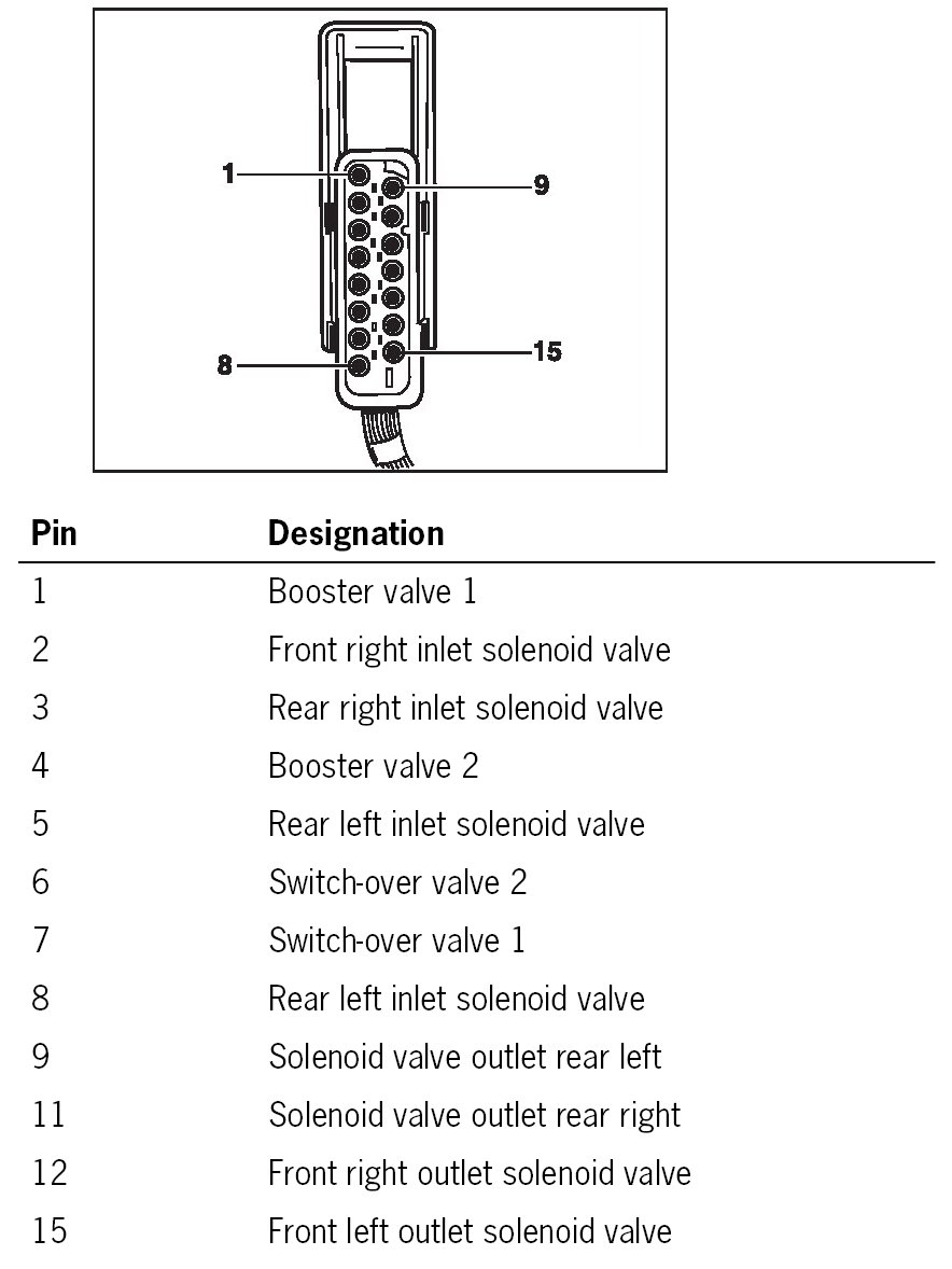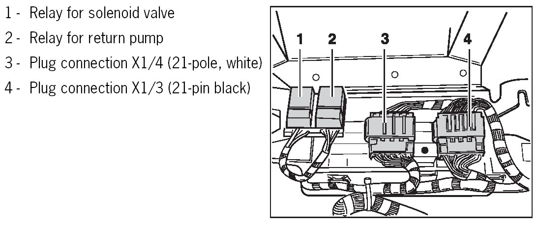 The plug connections X1/3, X1/4 and the solenoid valve and return pump relays are located in the passenger compartment wiring harness on the left at the front behind the PSM control module.