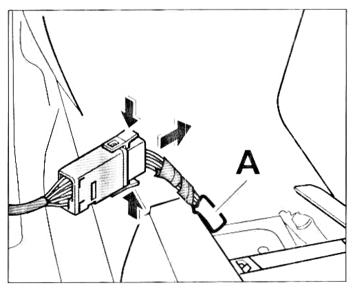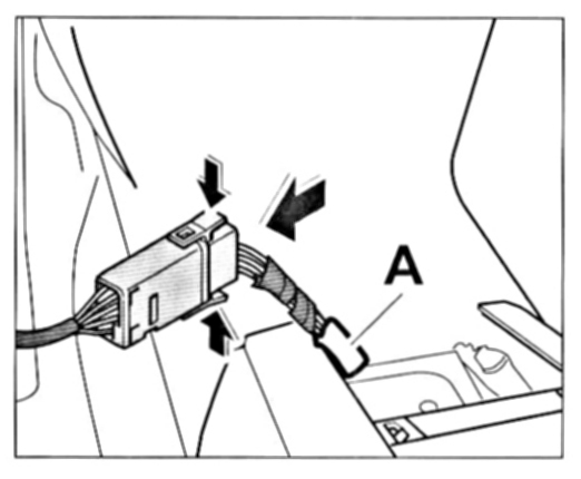 2. The 3-pin plug connection required for the EMERGENCY STOP switch is located under the cover in front of the shift lever and is marked with a white identification tape -A-. Connect the 3-pin plug to the plug connection of the EMERGENCY STOP switch and clip the relevant cover back into place.