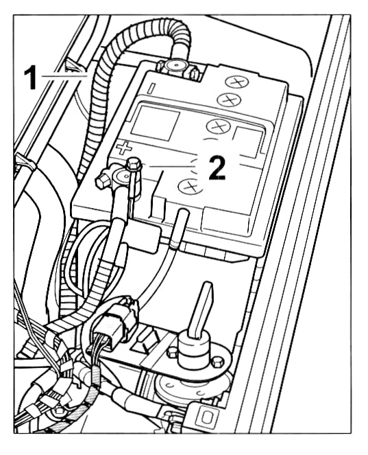 5. Unscrew the hexagon-head bolt M 6 x 12 on the positive cable -2- at the positive battery terminal.