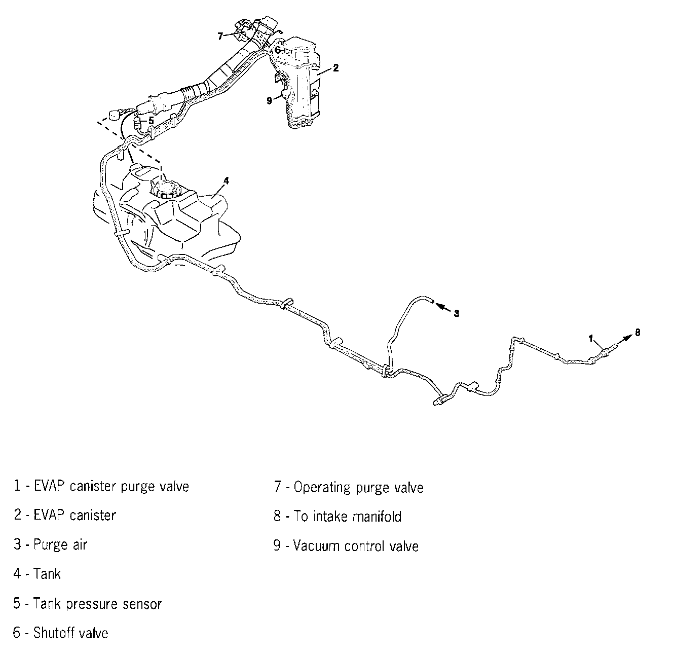 For this to occur, the EVAP canister purge valve (1) opens. Due to the vacuum predominating in the intake manifold, air is sucked up via the purge air line (3) through the EVAP canister. The air sucked up in this way draws the collected fuel vapours with it.