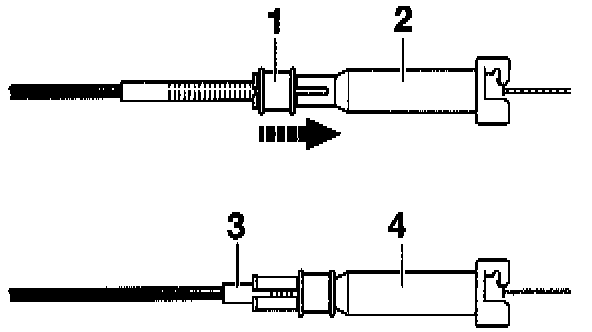 1. Loosen snap ring 1 at adjusting piece 2 (displace it) and push threaded part 3 through along with cruise-control cable.