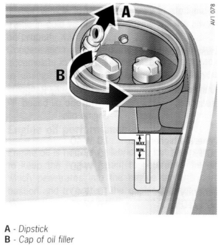 The dipstick and oil filler are in the rear luggage compartment.