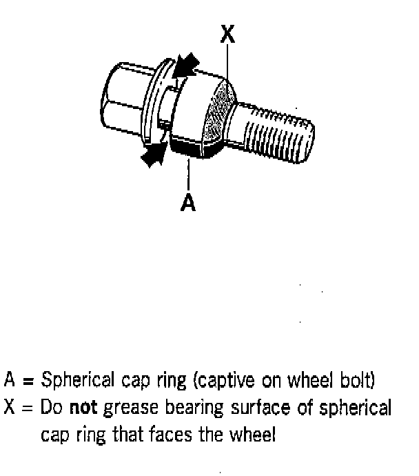 X = Do not grease bearing surface of spherical cap ring that faces the wheel.