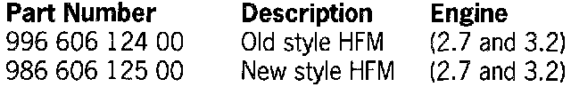 A barcode sticker will be attached to the air cleaner housing to make it easier to distinguish whether a new or an old HFM is installed in the engine. When replacing an old sensor, the DME will have to be reprogrammed. This is accomplished by using the PST2 with version 9.0 installed. Version 9.0 has a tentative release date of May 1, 2000. Please note that until software version 9.0 is released, continue to use the old style HMF sensor for repairs.