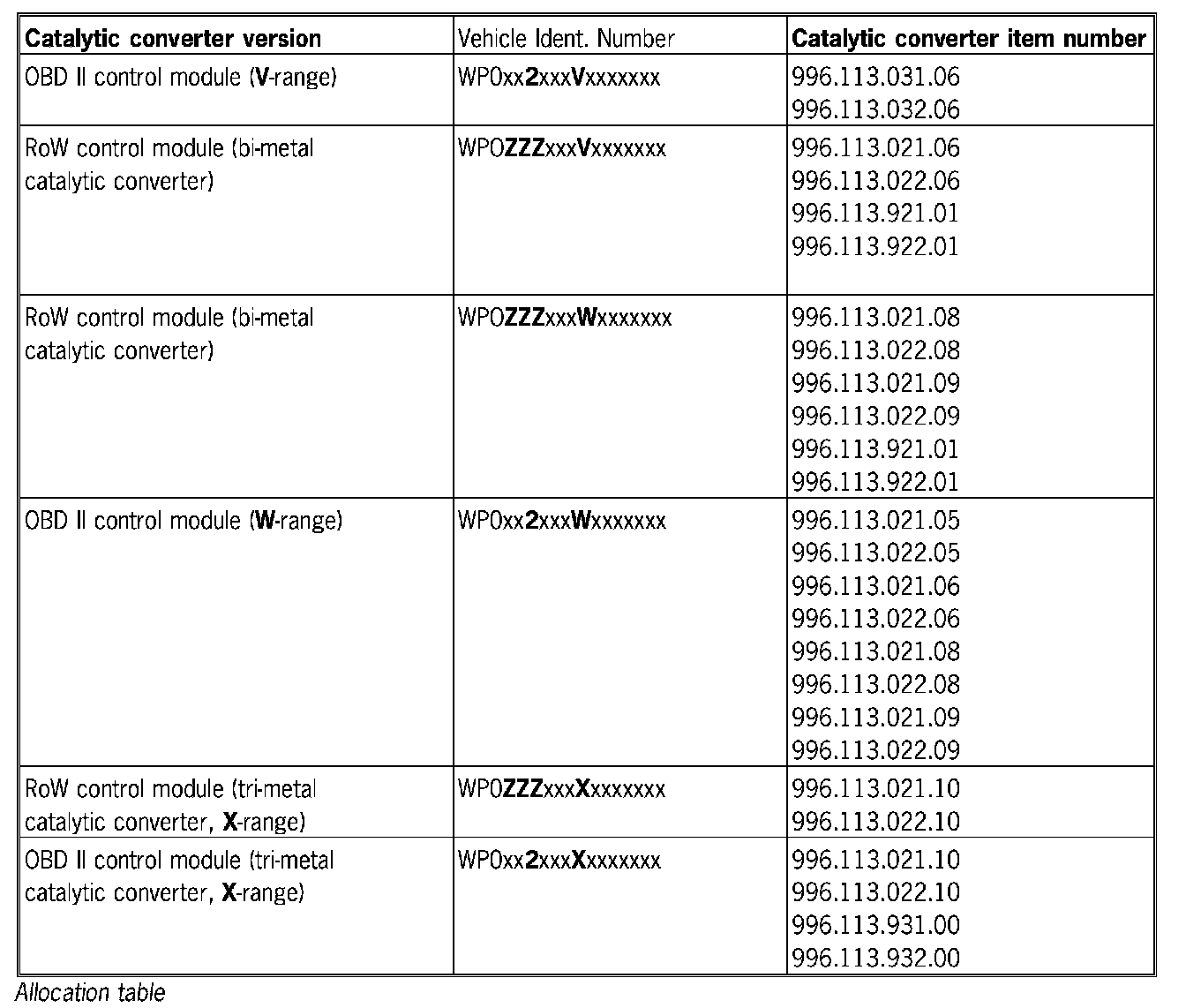 - Ensure correct allocation of the data record in the control module to the installed catalytic converter refer to the allocation table).